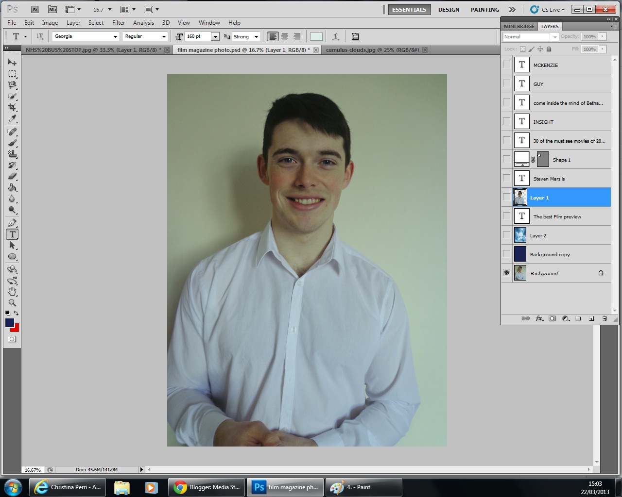 the image was taken from a photoshoot in the green room at college, using the white background I took several image of my actor.